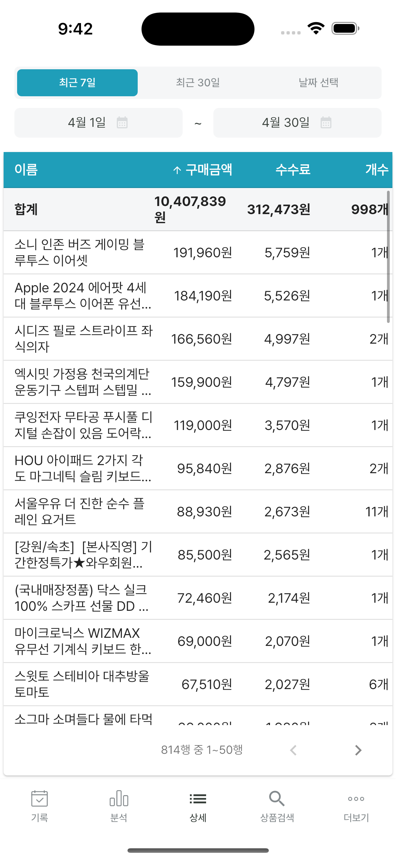 표 형식으로 제공하며 구매 금액, 개수, 수수료 기준으로 정렬도 가능합니다.