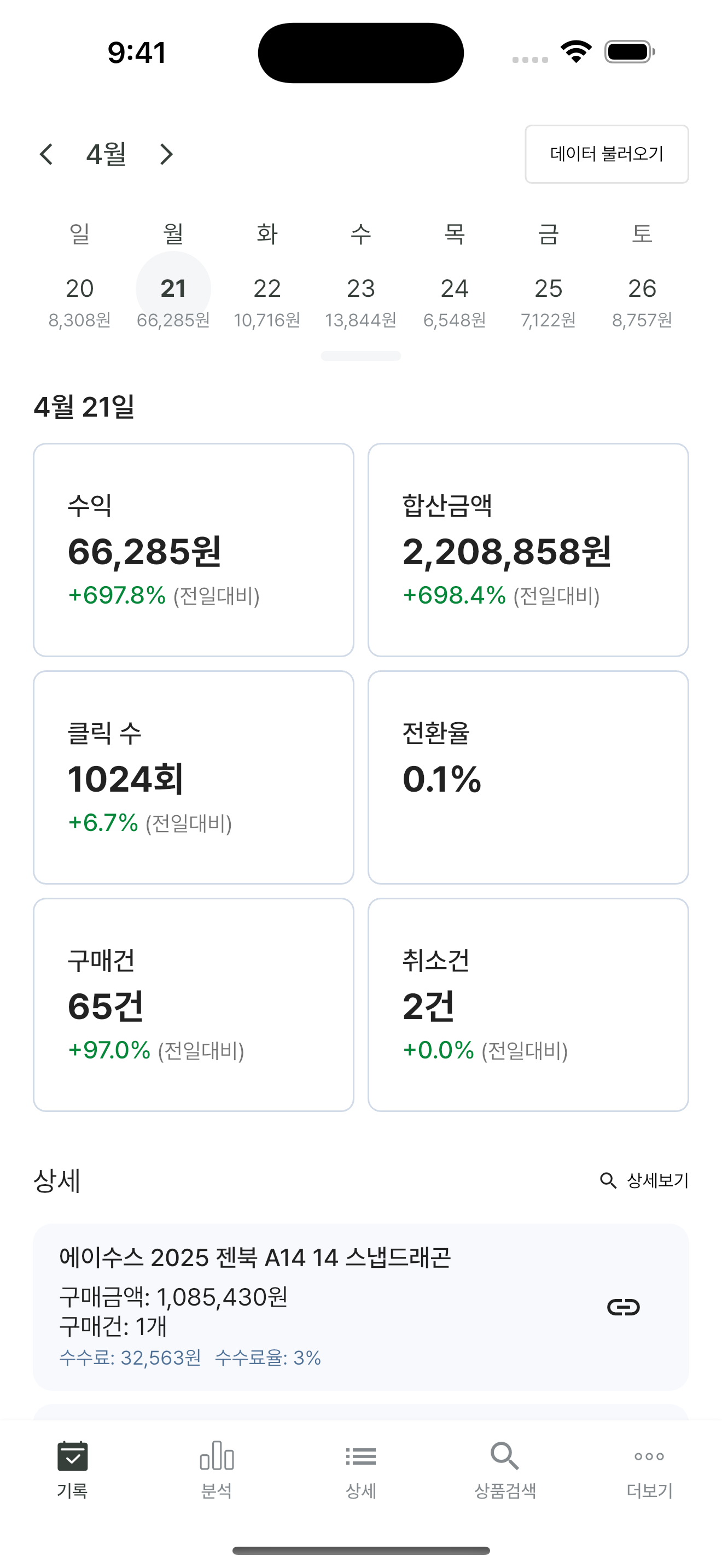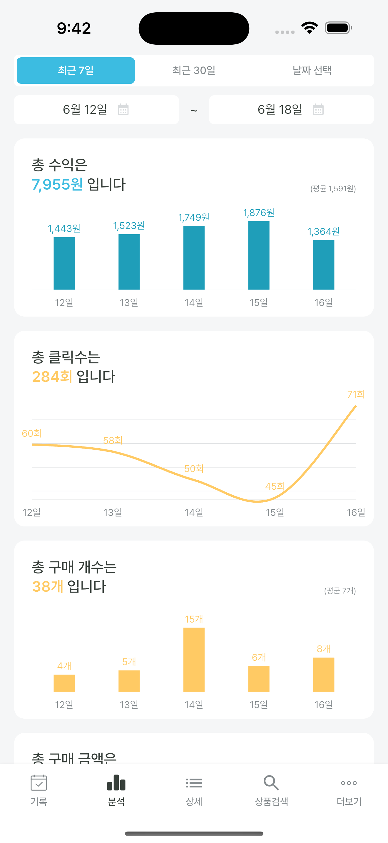 수익, 구매금액, 클릭 수 등 날짜별로 그래프화 시켜 분석을 제공합니다.