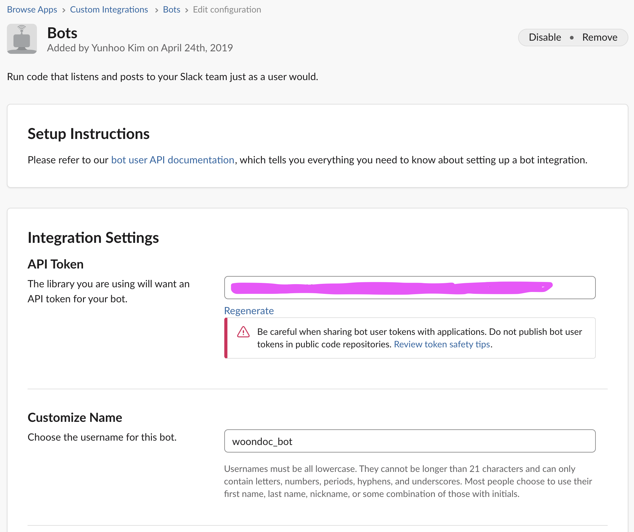 2. 생성된 Bot 페이지에서 발급된 토큰을 복사